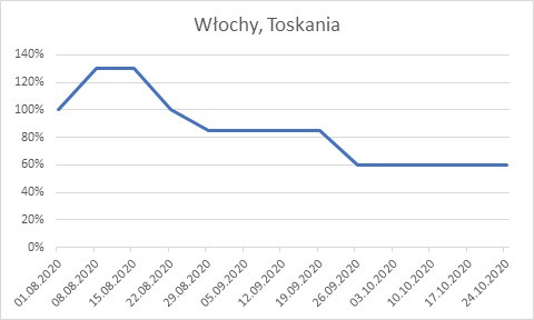 W załączonych wykresach pokazane są zmiany procentowe w cenach czarteru od 1 sierpnia (szczytu) do końca października. Często zmiany w cenach świadczą o zmianie pogody, choć nie jest to regułą - popyt zwiększa np, odbywająca się w tym miejscu impreza żeglarska, a pogoda wtedy niekoniecznie jest lepsza. Oczywiście ceny uzależnione bywają też od świąt i wolnego - na majówkę bywają droższe niż dwa tygodnie później.