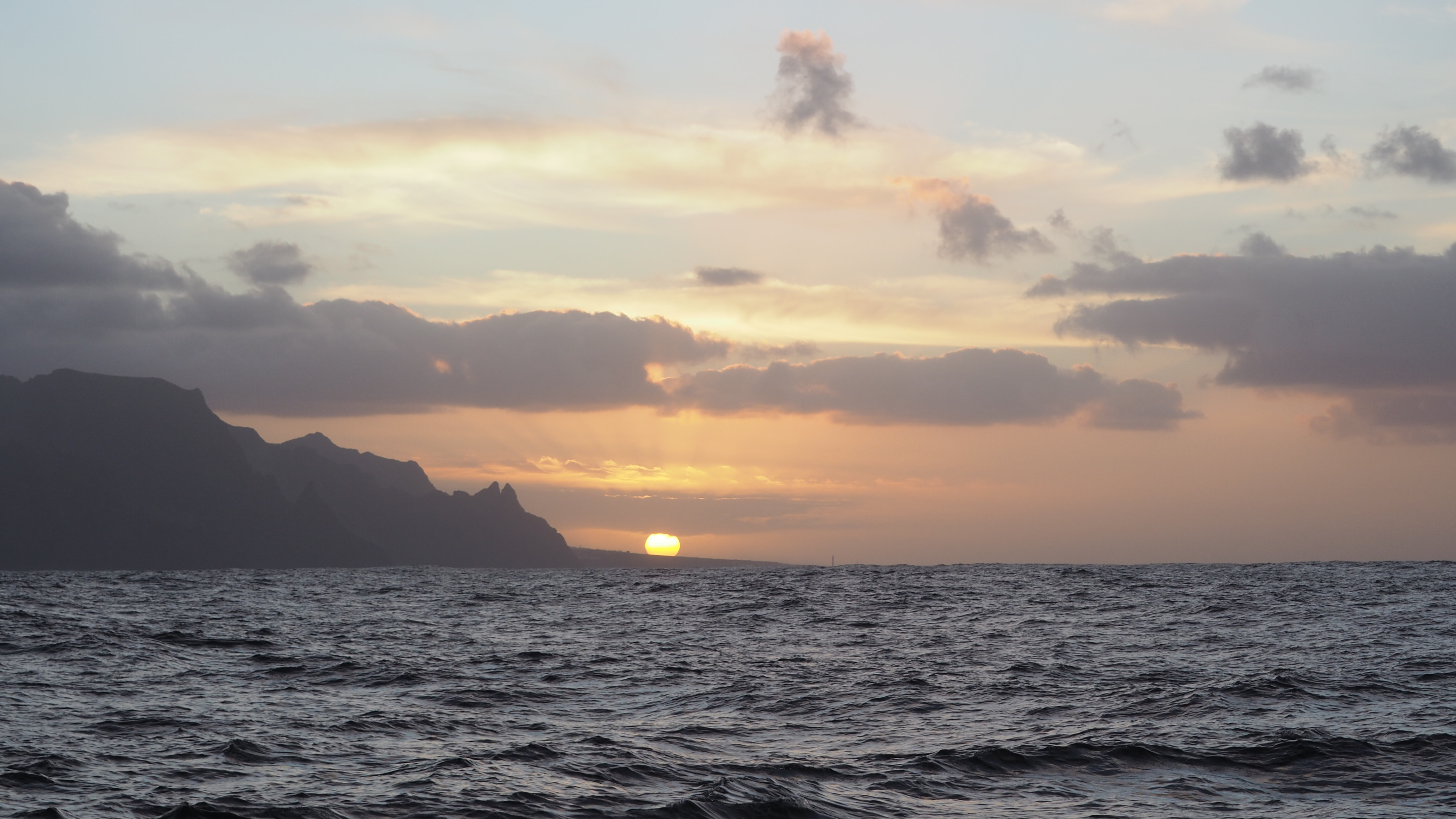 0 5ej rano startujemy, Aśka wypłynęła godzinę wcześniej. Mają być jeszcze silniejsze porywy przez godzinę, potem ma siadać. Zakładamy 3 refy, fok zrolowany do połowy. Wiatr nie jest tak silny jak zapowiadali, max. 22 – 24 kn. Ale na razie płyniemy pod gwiazdami. Na wschodzie widać ślad poranka. Rozrefowujemy żagle do pełna, ale wiatr siada. Choć wieje z północy, a nasz kurs powinien wynosić 900 płyniemy ostrzej, potem wiatr będzie w mordę, jak zawsze biednemu. Musimy wspomagać się silnikiem. Słońce coraz wyżej ale temperatura niekoniecznie. Długa oceaniczna fala przemieszcza się dokładni z północy. Ma 3 metry, ale przy swojej długości daje tylko rozkołys, który nie każdy dobrze znosi. Śniadanie – każdy we własnym zakresie, choć niektórzy nic nie jedzą. I tak będzie cały dzień. Po prawej burcie pokazują się delfiny, przeskakują 2 – 3 metry obok nas. Poza tym cisza. Wiatr powoli słabnie, na przynęty wędkarskie które holujemy za sobą na 3 wędkach też nie ma chętnych. Cały czas płyniemy na żaglach + motor, dopiero o zachodzie słońca, przy północnym brzegu Teneryfy pozostaje sam main sail diesel. Dokładnie przy Punta de Anaga na północy wyspy obserwujemy wspaniały zachód słońca. Potem szybko następuje mrok. Przed nami Santa Cruz de Tenerife do której dopływamy po 17,5 godzinach od startu. Po drodze spory ruch statków, sporo stoi na kotwicy. Ale te które pływają zmieniają swoją prędkość i kierunek, trzeba być czujnym jak owsik. Wchodzimy do mariny, wejście pomimo rzęsiście oświetlonego brzegu dobrze widoczne, choć marina zaleca wejście przy świetle dziennym. Skipper bywał tutaj już kilka razy, zawsze wpływał w nocy, więc i tym razem nie było problemu. Najpierw na 12 VHF wywołujemy port z prośbą o możliwość wejścia, szybko uzyskujemy zgodę. Potem na kanale 9 wywołujemy marinę. I to kilka razy, w końcu mamy aprobatę, stajemy przy 1 pomoście. Za pół godziny dopływa Asia ze swoją załogą, cumują obok nas. Kolacja – to w zasadzie odgrzana kolacja z dnia poprzedniego, co znacznie skraca procedurę. Potem jakieś drinki i idziemy spać. W linii prostej pomiędzy portem wyjścia portem docelowym byłom105 nM, ale liczą nasze myszkowanie, co na jachcie jest w zasadzie regułą, wyszło ich 120. Niezły wynik.